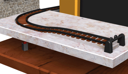 On both platforms the train runs up a small incline, to help give it some initial momentum when it starts moving again. The train is held in place by a spring-loaded flap that the train can roll over in one direction. The flap is connected to the bottom of the display, so once the platform elevates the train can move freely.