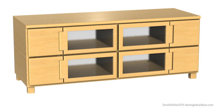 Here is a TV stand for displaying game consoles behind glass doors. In my experience, glass doors are often a hindrance for accessing electronics, so I wanted a system where I can stow these doors on demand. This is ideal for an enclosed display case that is also completely accessible when needed.