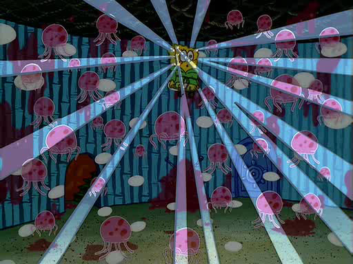 This lamp is based on an episode titled “Jellyfish Jam”. In one scene Spongebob is haplessly affixed to a ceiling light and spun (like a disco ball) by a horde of jellyfish. Light is emitting from all of his pores, making for a festive atmosphere.
